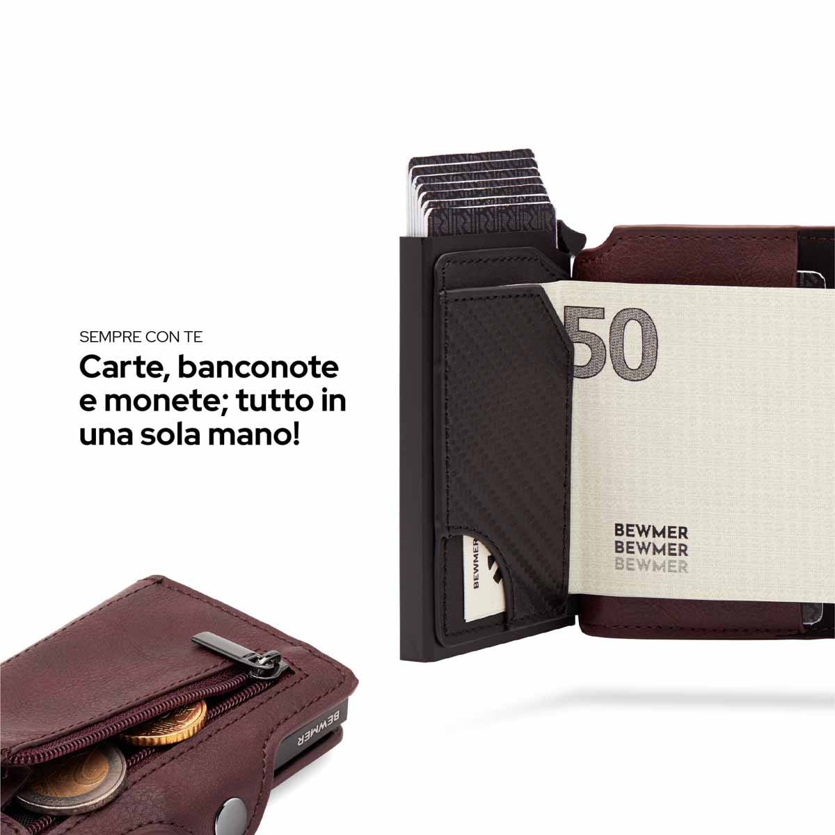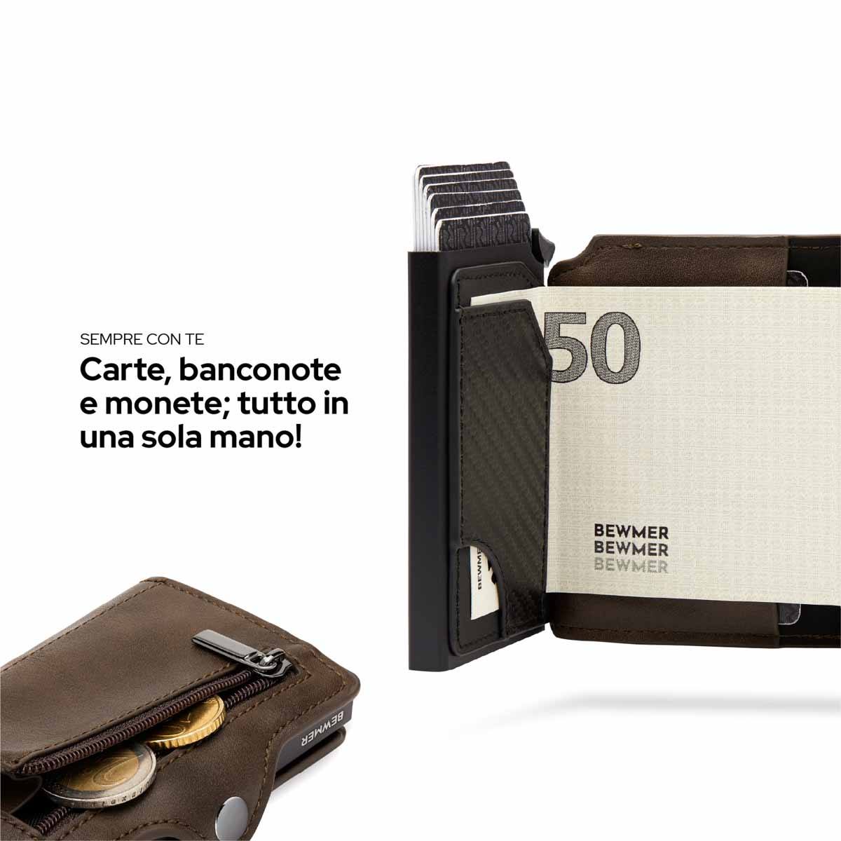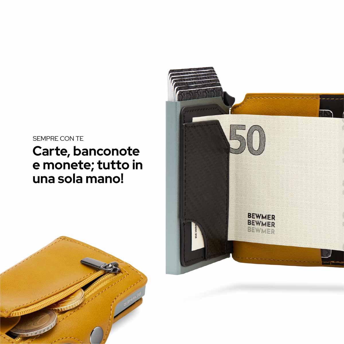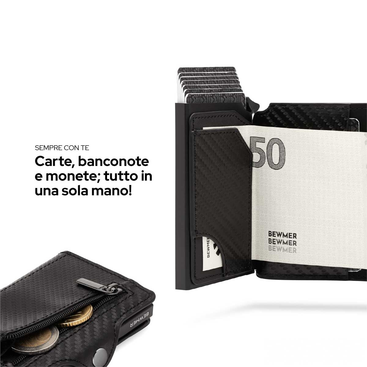 Bewmer 1 e 1 ZIP possiedono un innovativo sistema di blocco carte che impedisce la caduta accidentale di queste ultime. Per un corretto funzionamento si consiglia di inserire 6/7 carte.