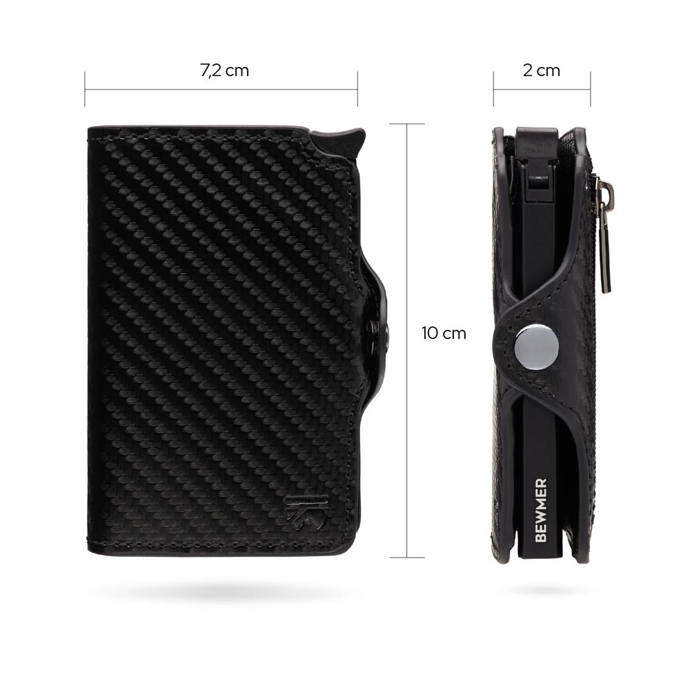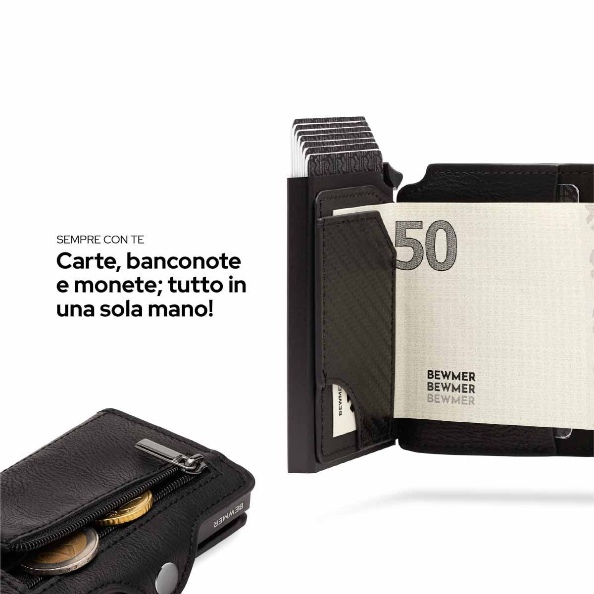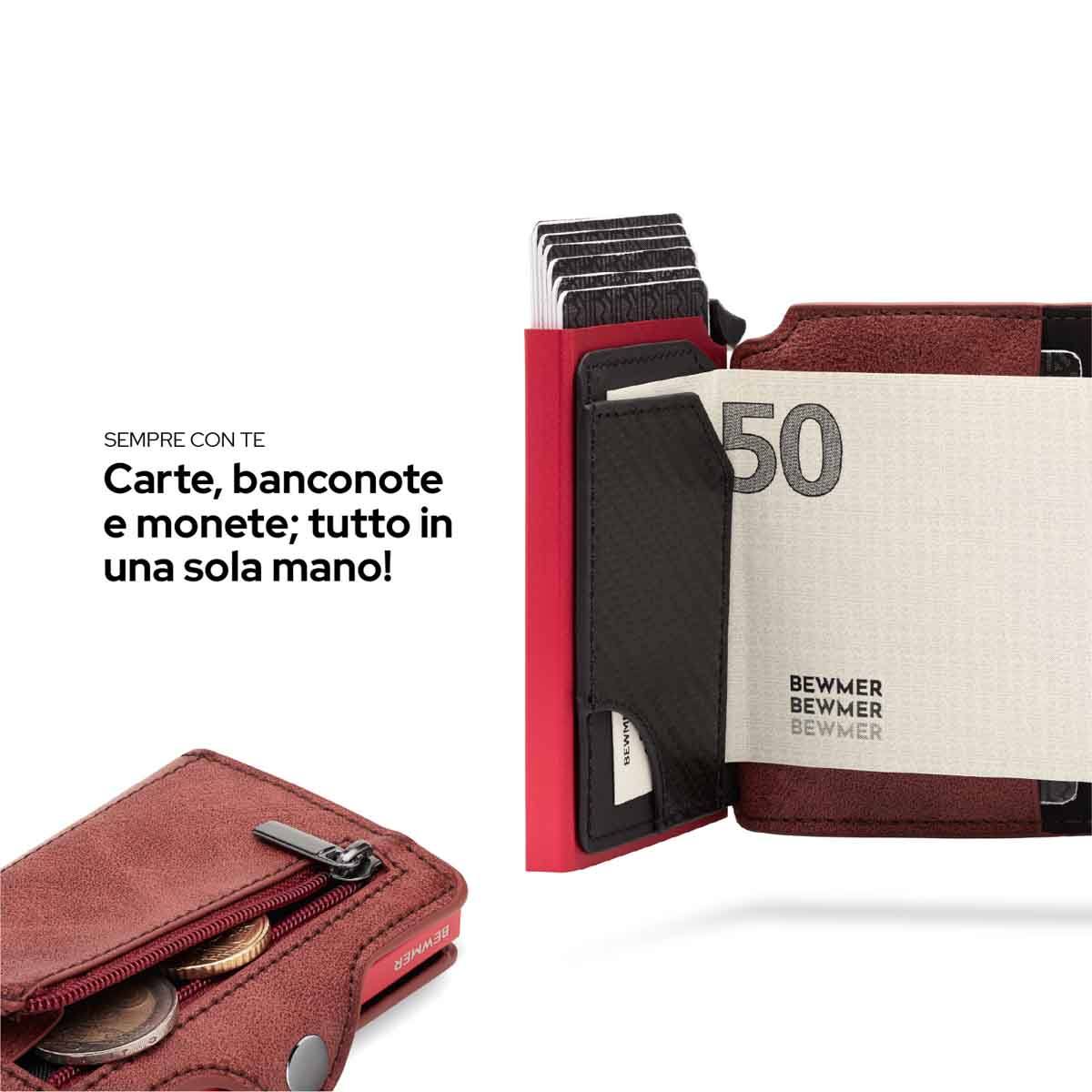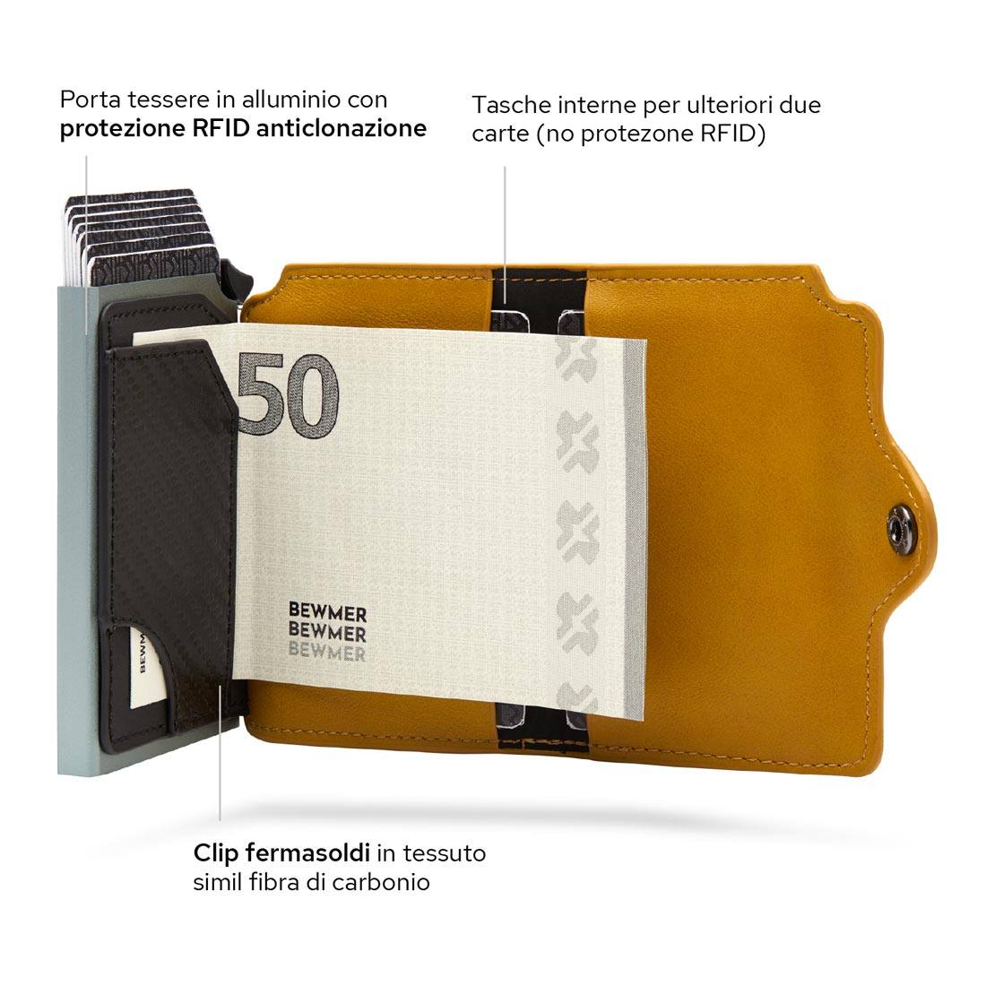 Bewmer 1 e 1 ZIP possiedono un innovativo sistema di blocco carte che impedisce la caduta accidentale di queste ultime. Per un corretto funzionamento si consiglia di inserire 6/7 carte.