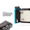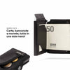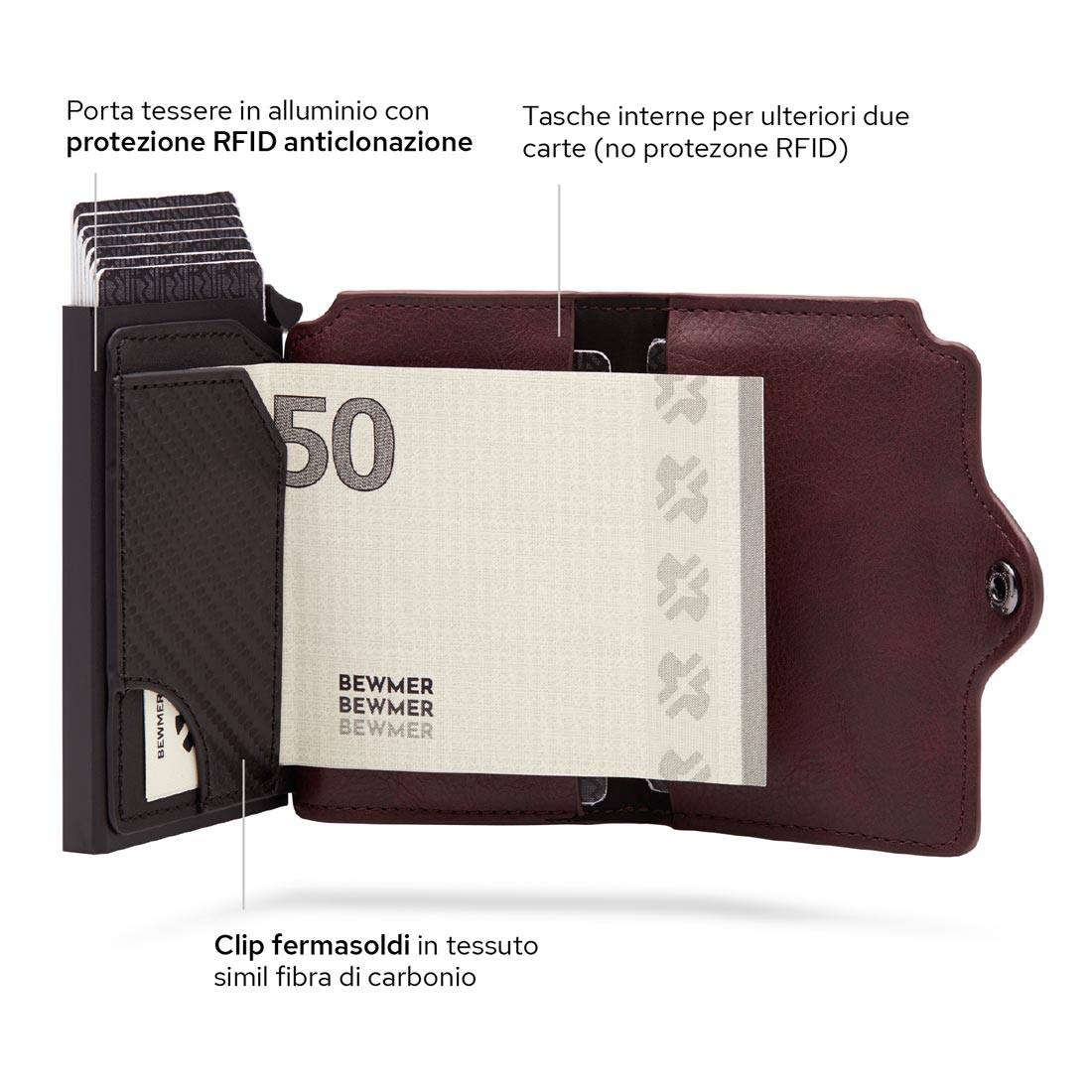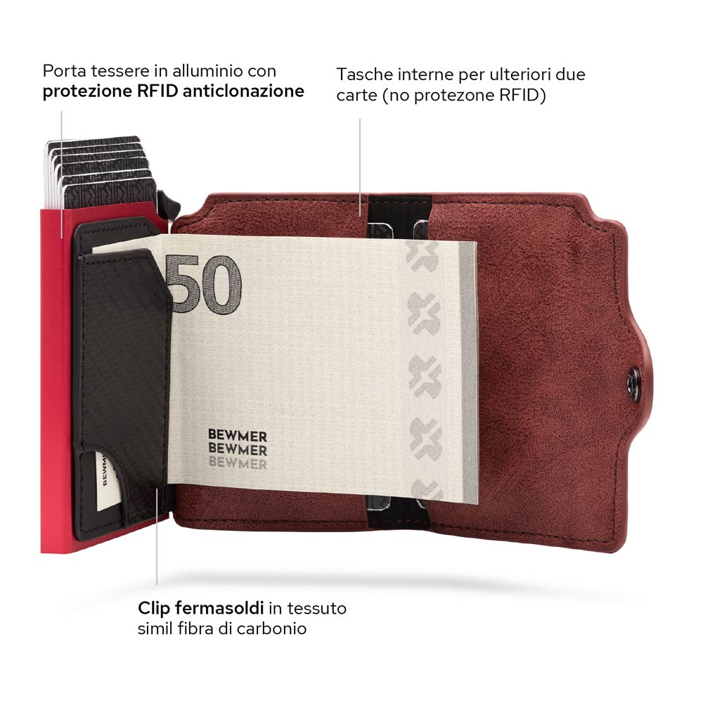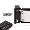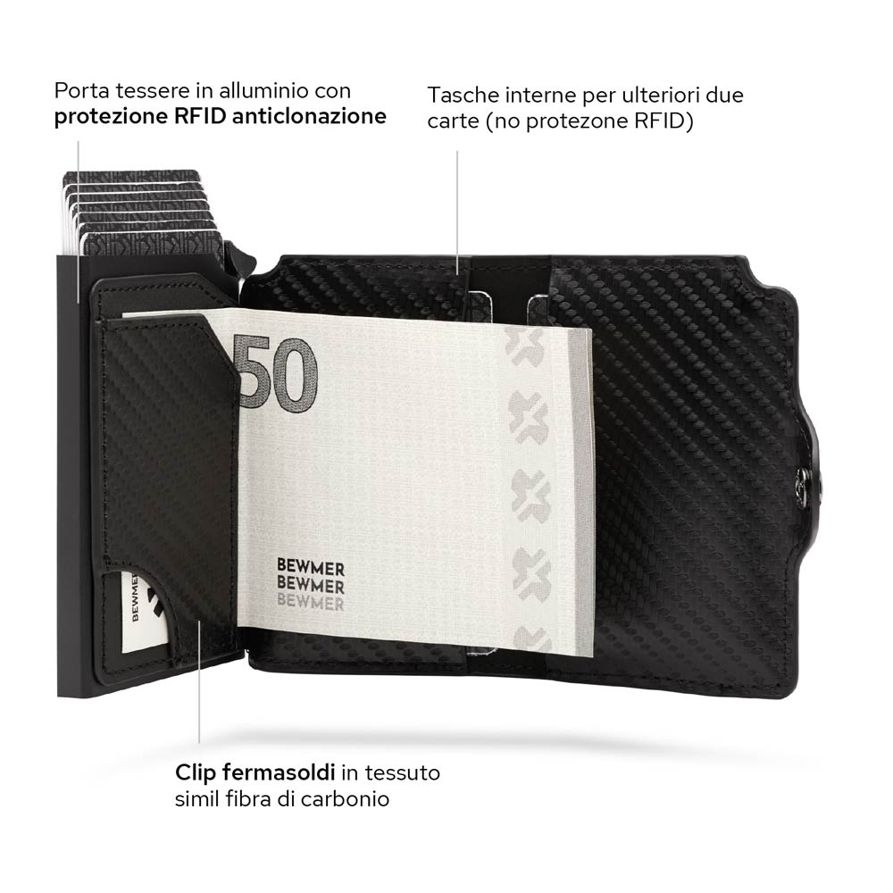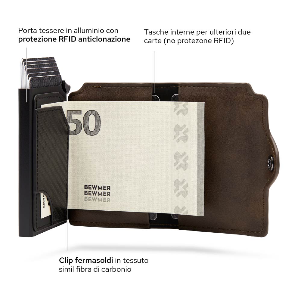 Grazie alla clip ferma soldi interna in simil carbonio, le due tasche interne e la cassa in alluminio porta carte (con protezione RFID) potrai portare le banconote e le carte sempre con te!
